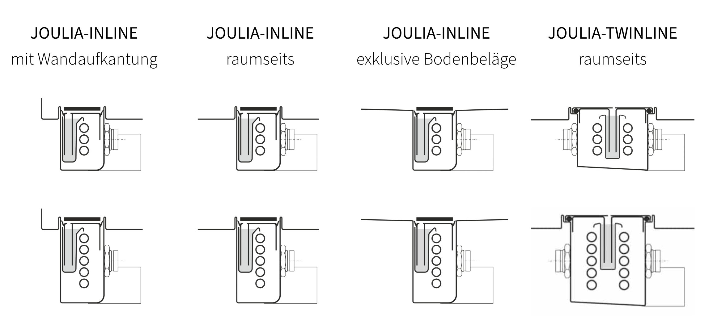 Inline-Variante für besondere/hochwertige Bodenaufbauten (z.B. Naturstein, Spezialaufbauten), mit anderer Geometrie/Integration. Funktional gleiches Prinzip, aber für Design-/Belag-Fokus.